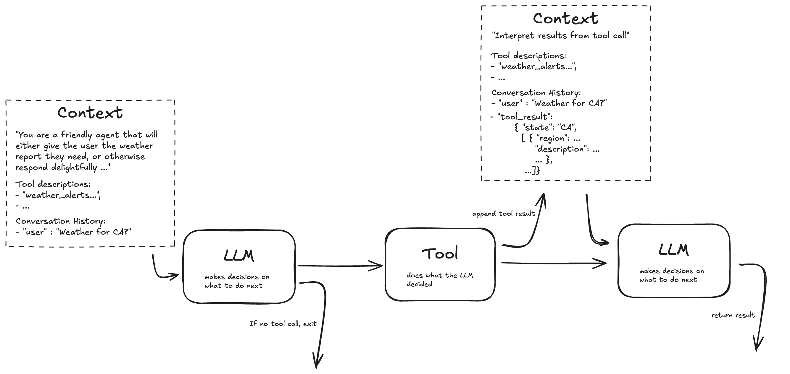 • and if a function has been called, the result is appended to the context that is then sent back to the LLM for interpretation (the LLM is instructed to format the tool response).